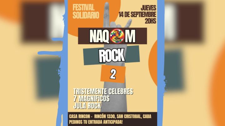 El próximo 14 de septiembre llega el NAQOM Rock 2, un festival solidario para ayudar a la comunidad de pueblos originarios del Impenetrable chaqueño. Esta nueva edición contará con la presencia de Tristemente Célebre, la banda de Edu de la Puente, 7 Magníficos y Jula Rock. La cita es en Casa Rincón, Rincón 1330, San Cristobal, CABA.