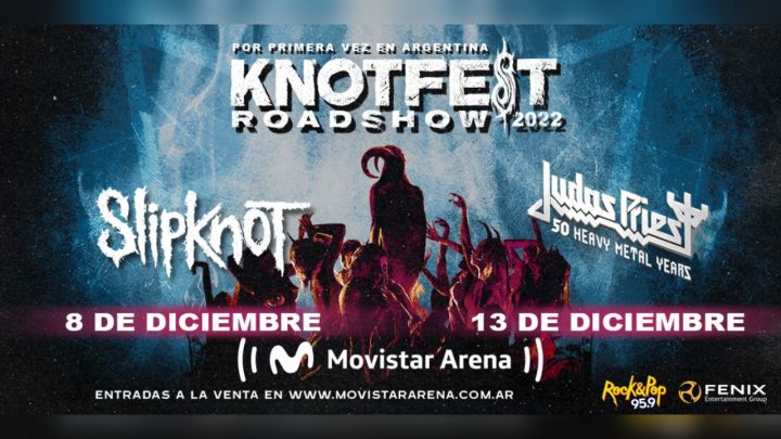 ¡Atención patria metalera! El festival de metal más importante del mundo anuncia su desembarco en la Argentina con una previa a lo grande: el Knotfest Roadshow, con dos jornadas impactantes en el Movistar Arena de Buenos Aires (Humboldt 450, CABA). Primero SLIPKNOT -a punto de estrenar su nuevo disco The End, So Far- se presentará el 8 de diciembre inaugurando su festival; y JUDAS PRIEST -que conmemora su 50° aniversario con la música- tocará el 13 de diciembre. Las entradas se podrán conseguir desde el 25 de agosto a las 12hs en www.movistararena.com.ar